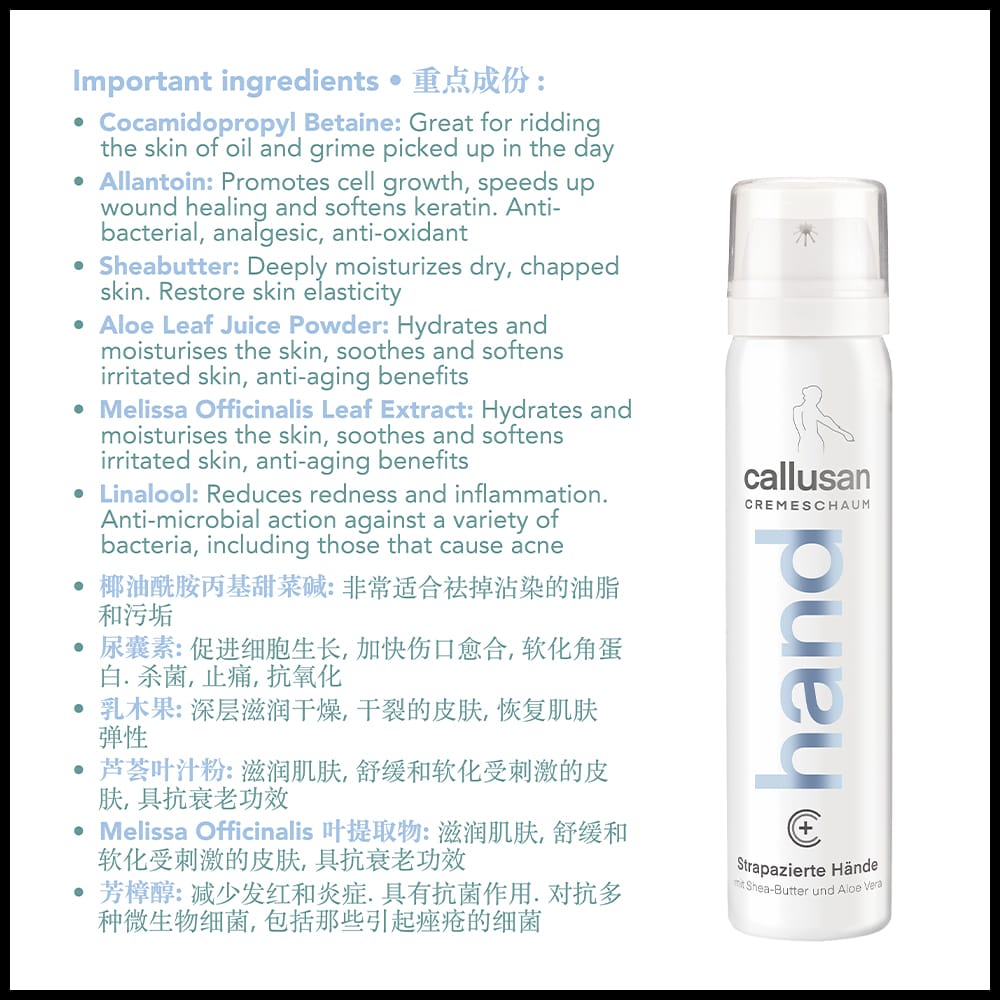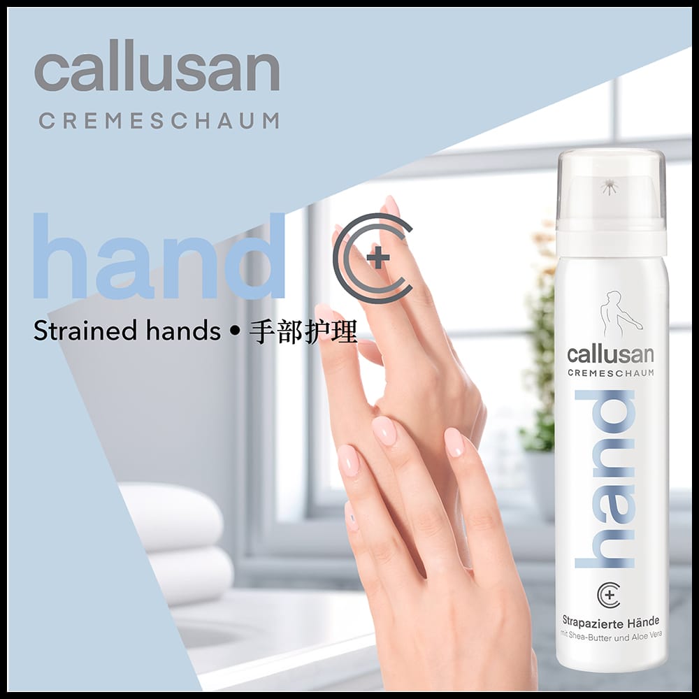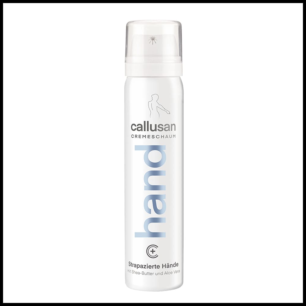 Reliable skin care for stressed hands without affecting grip and sense of touch. Callusan cream mousse hand+ is fine-pored and absorbed quickly without leaving a greasy film behind. It leaves the skin feeling pleasant. Contains precious shea butter and moisturising aloe vera. Also contains allantoin and melissa extract. Ideal for quick hand care after washing or from time to time.